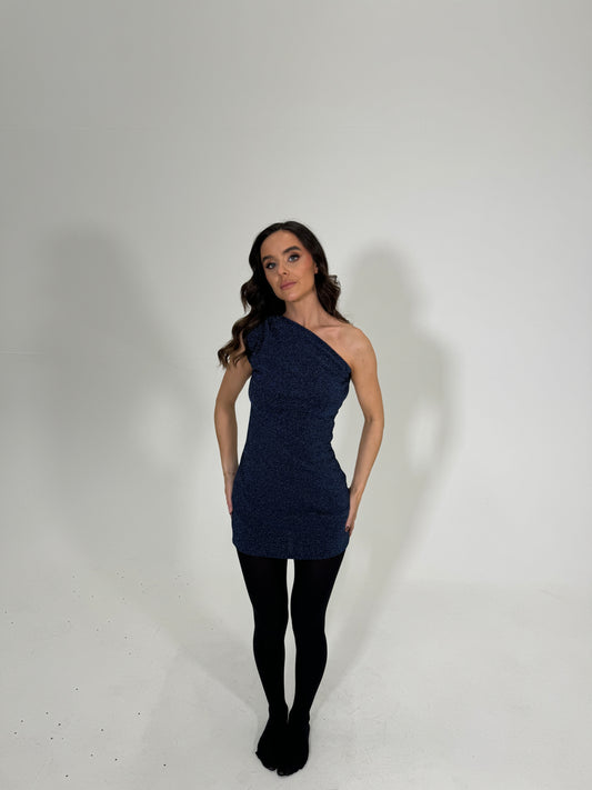 One shoulder mini dress navy glitter size small, petite SAMPLE